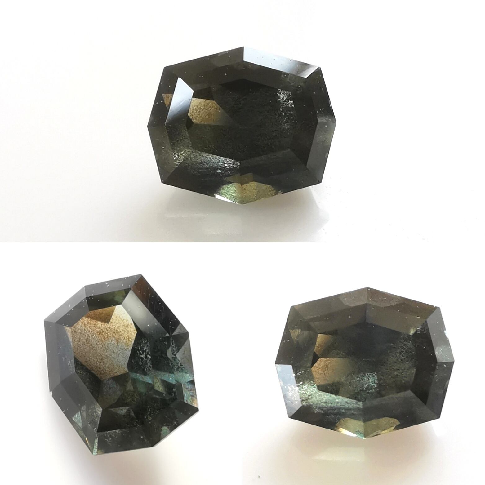 クラリティは、パビリオン側に霧状の灰茶錆の色斑/色溜まりが見られます。色溜まりのある部分の側面に光源をあてるとキラキラするシーンの輝きが確認できます。