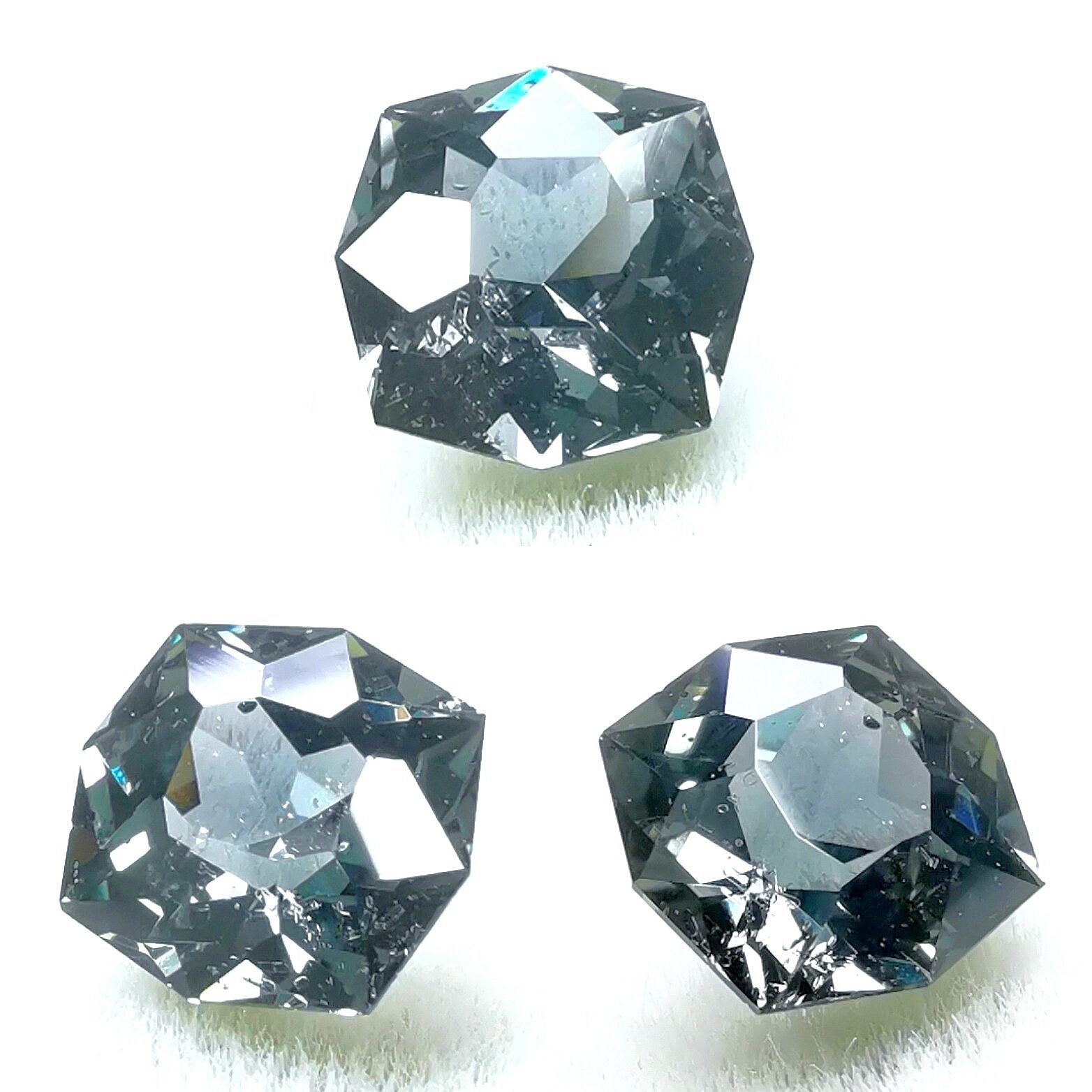 写真では完全にお色味を伝えきれておらず、灰色つよく見えていますが。実物は光源の種類や強さにより、青緑や草色に色味がシフトし多色が綺麗。