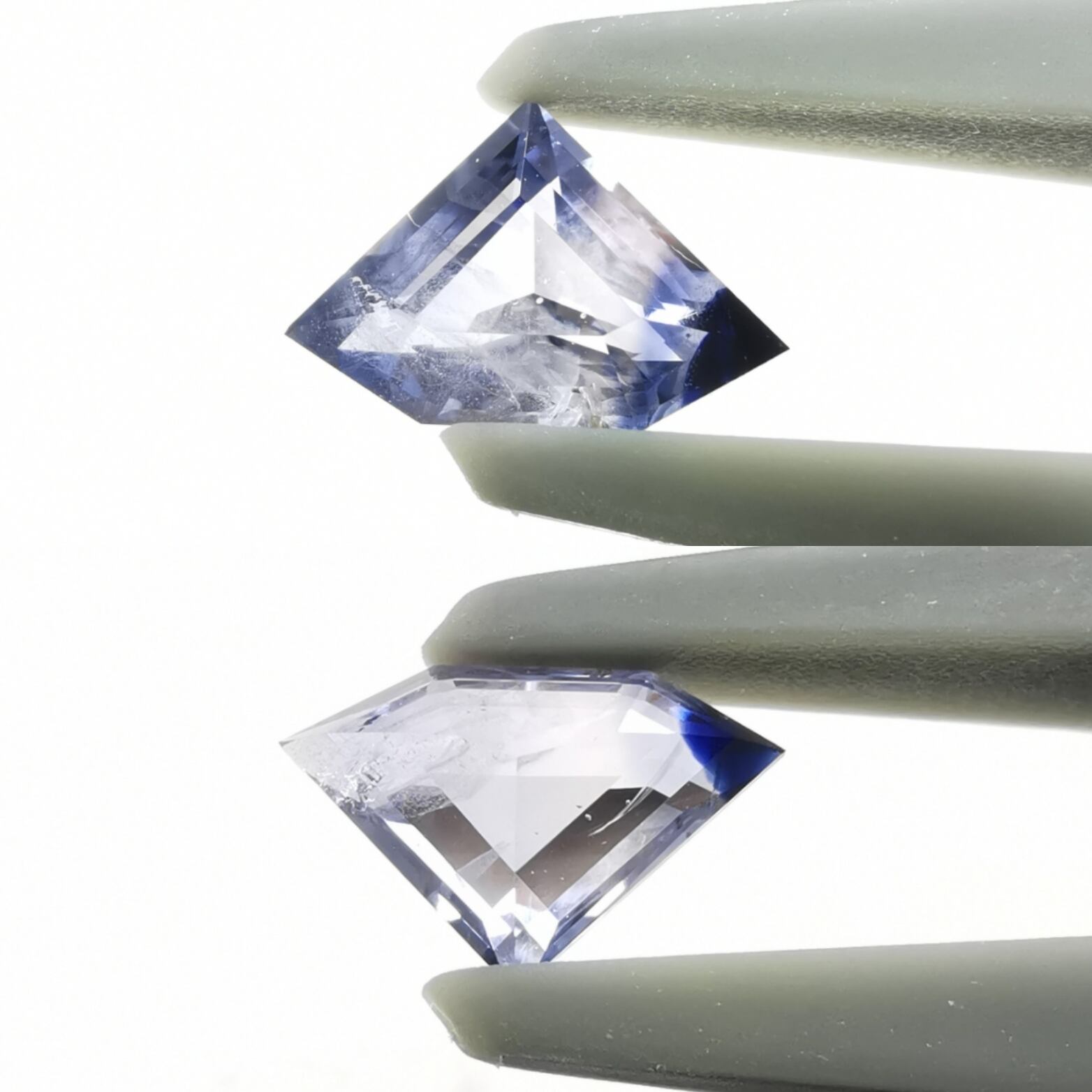 カラーレス9割 : ブルー1割 と、明らかに2色の割合に差があったり、もわもわとした内包物などみられ、クリアではありませんが。無色と相性の良い青のサブカラーがポイントになっており、1辺の端からディープ〜ミディアムとWラインのグラデーションに見えるのが特徴です。