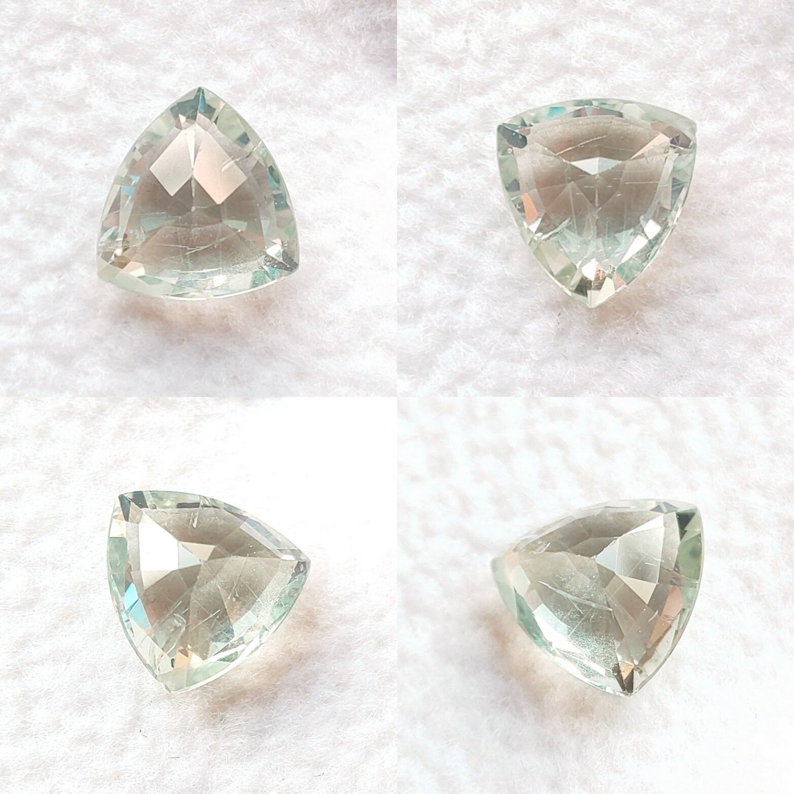ご覧のとおり、亀裂や割れが見られるのですが。透明感のあるミントグリーンと変則トリリアントカットとのケミストリーで、不思議と嫌な感じはせず。
