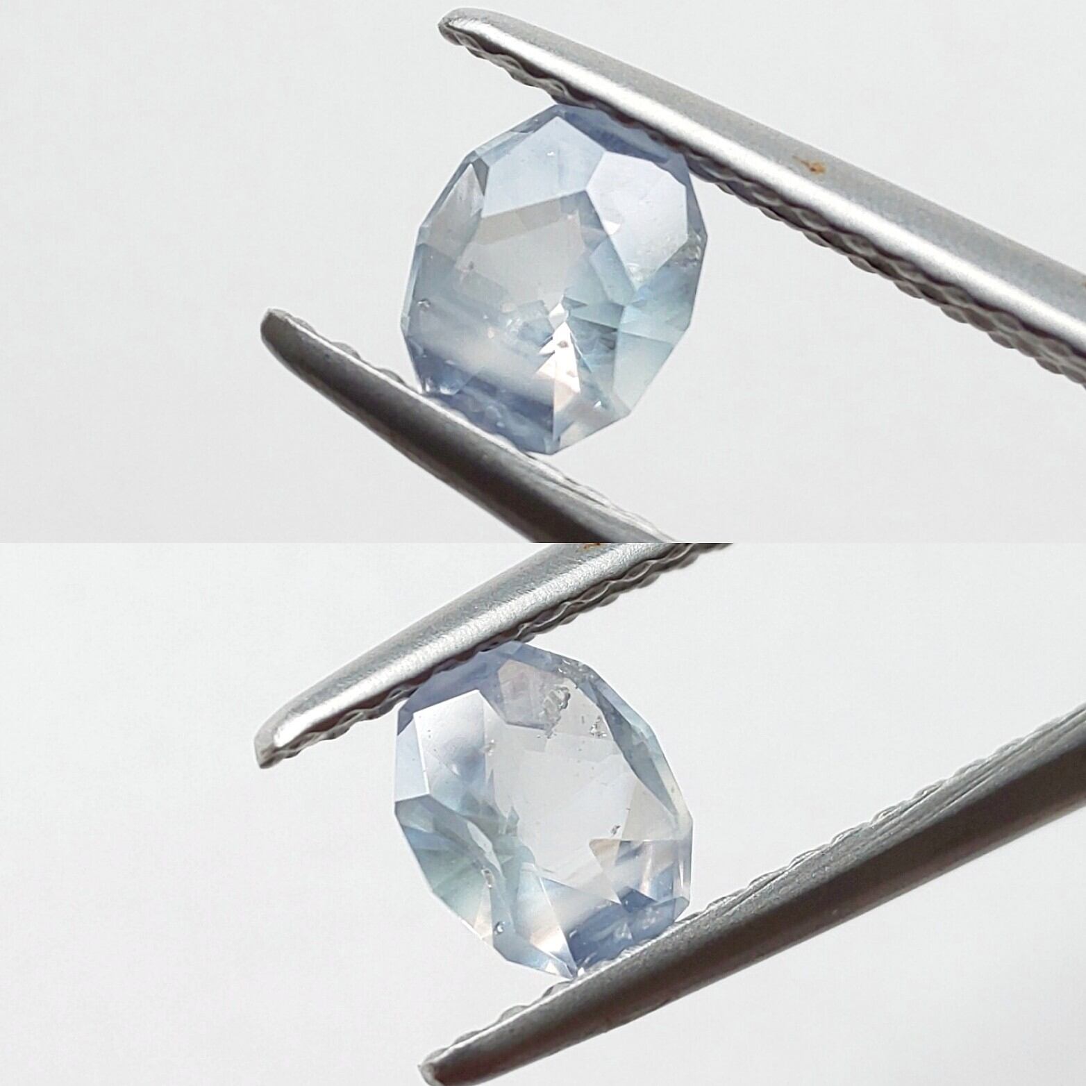 此方の風変わりなルースは、元は1.07カラットの微かに青味を帯びたシルキーグレーサファイアをスリランカにてリカットし現在の御姿へ。