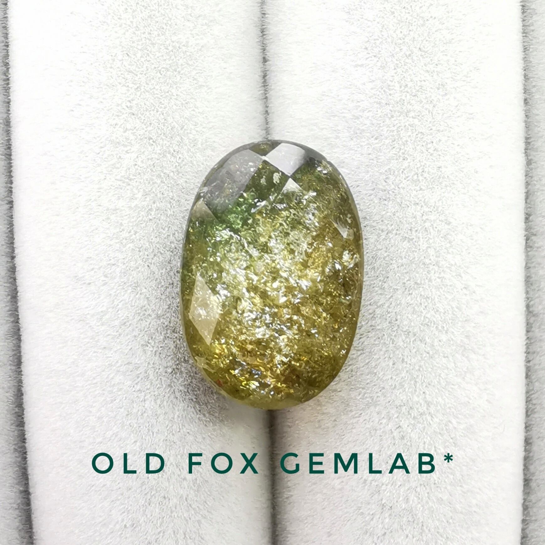 見ての通り、無数の大小含むクラックやインクルージョンの影響により、細かなラメの様な輝きと、割れ虹が目視できるポイントがあります。