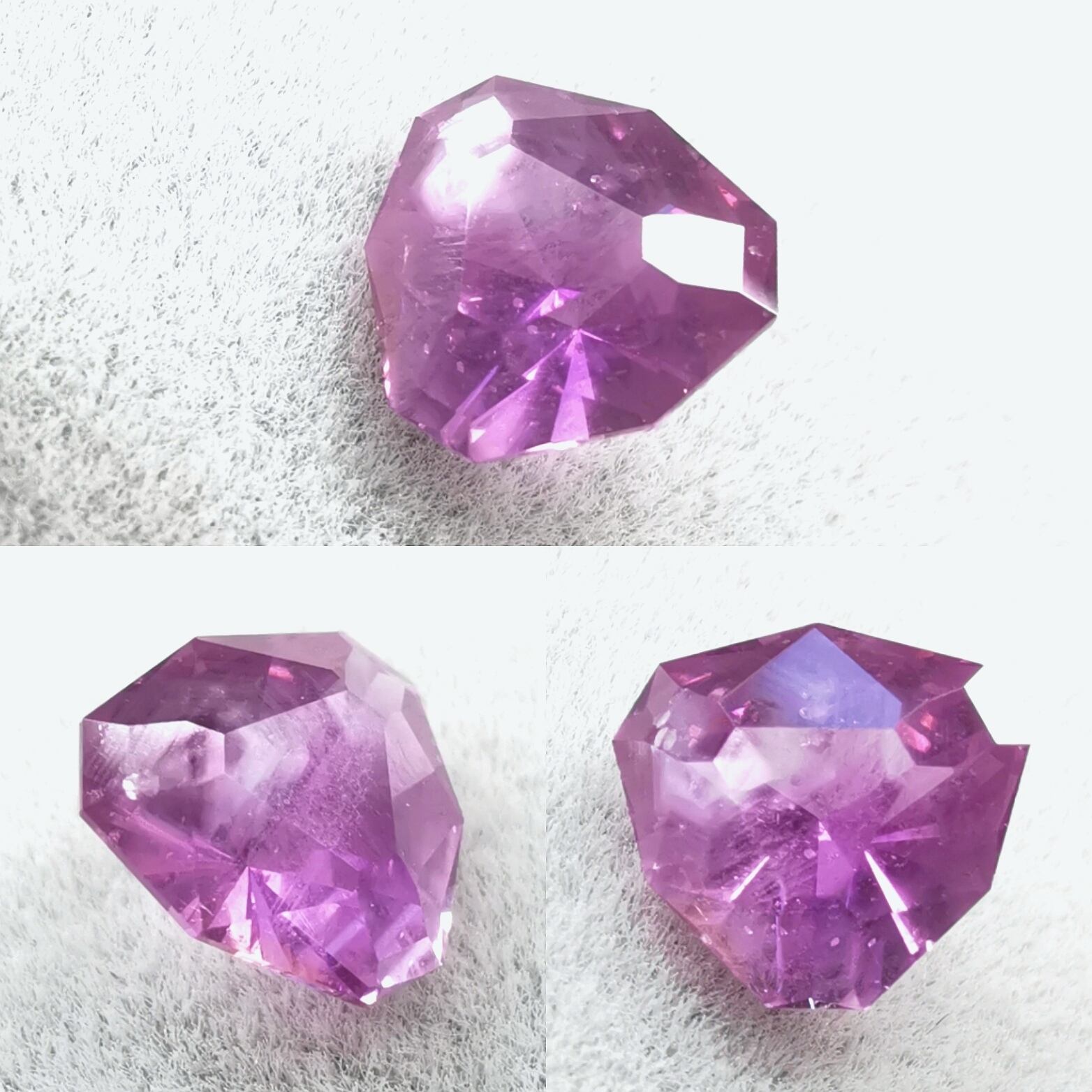 パープルをかんだピンク、淡いマゼンタや、ロゼといった感じの人気カラーに。波紋や星あざのような半アステリズムが浮かぶ面白いサファイア。