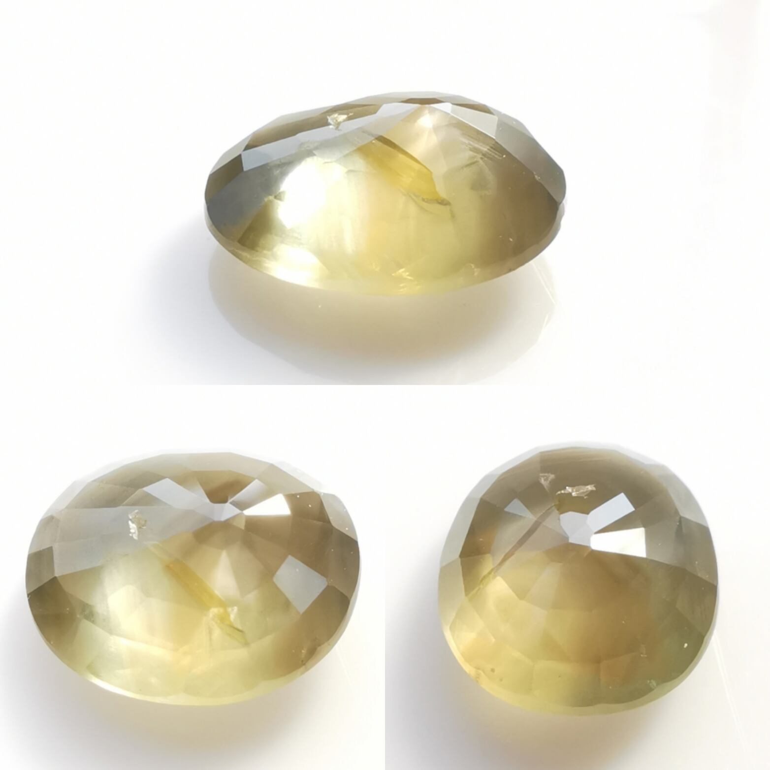 クラウン側に目立たない薄い内傷、パビリオン側一部表面に達するクラック/チップ、カット不整あり