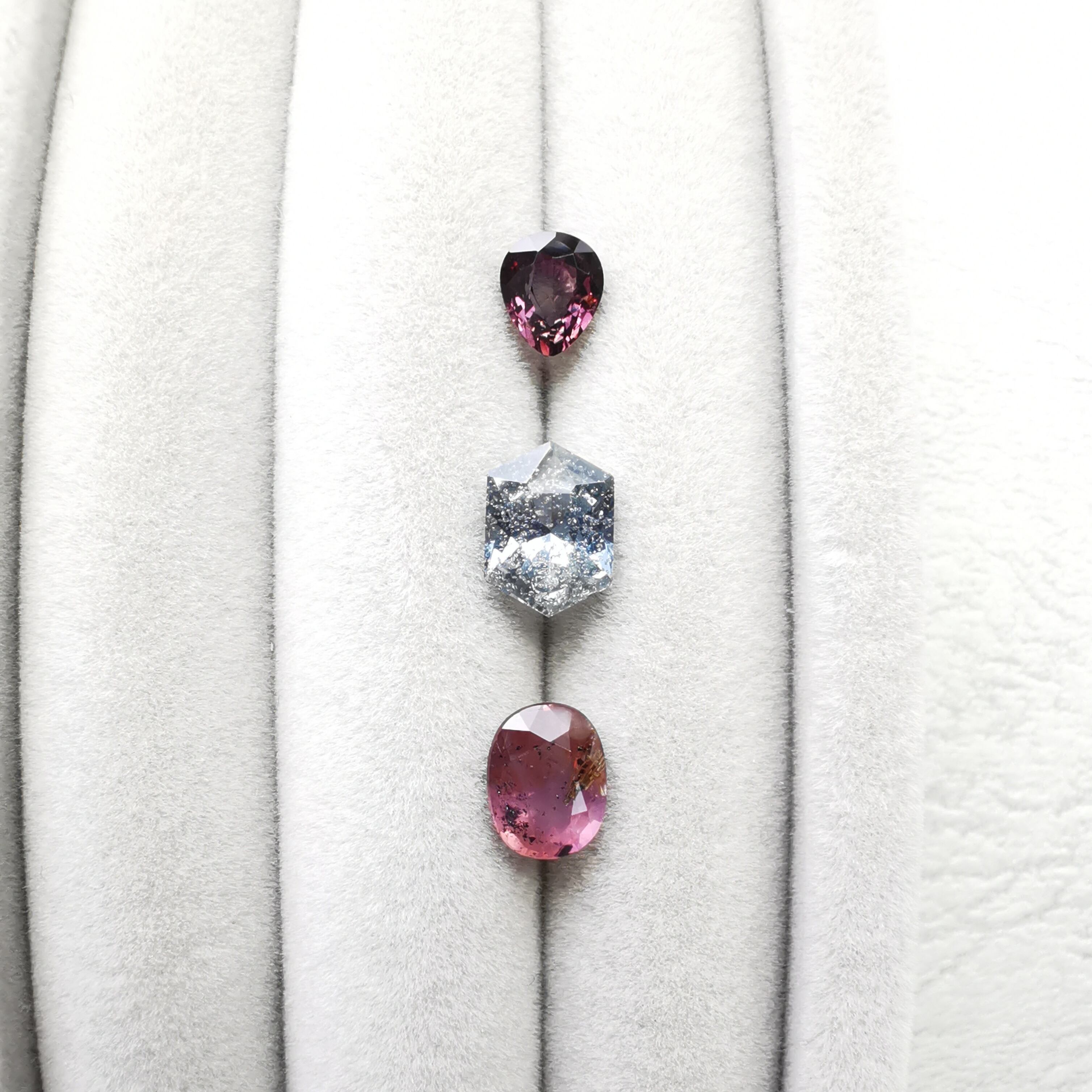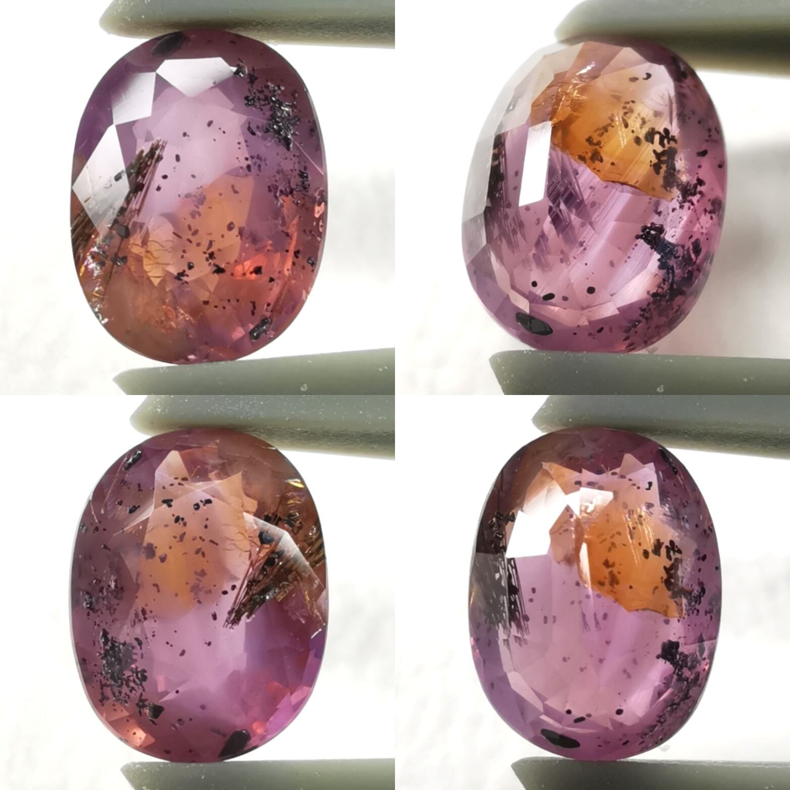 わずかに乳白がかったディープパープリッシュピンクとモーブオレンジ、迸る内包物が無二のアクセントになっている情報量の多い個性的なサファイア。